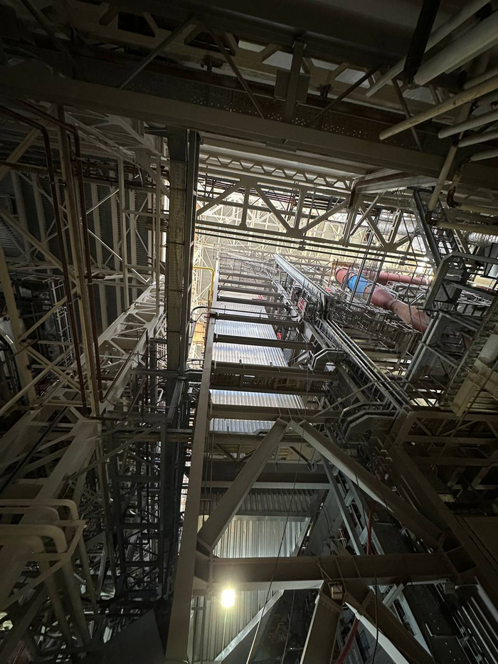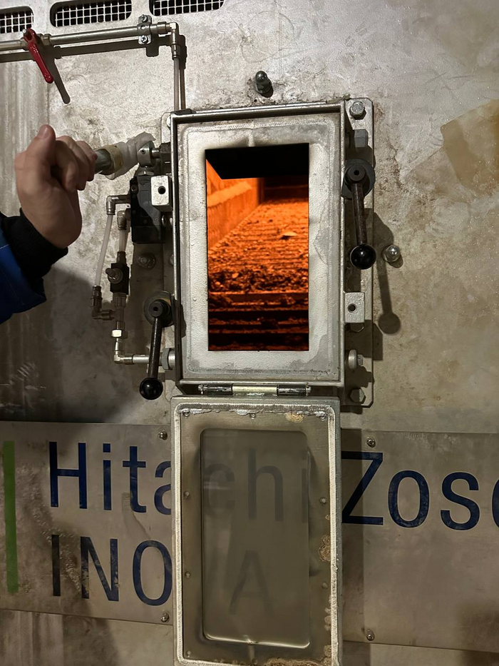 Технология Hitachi Zosen Inova используется и в котельном отделении, на подвижных колосниковых решетках, позволяющих безопасно и экологично утилизировать неперерабатываемые отходы. Здесь есть специальный люк, заглянув в который, можно увидеть пламя. Сейчас завод находится на этапе пусконаладки, поэтому пока там горит газ, но в дальнейшем там будут сжигаться только отходы после предварительной сортировки.