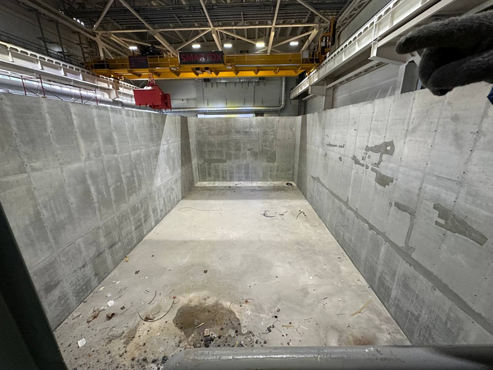 Так уже выглядит отделение шлакоудаления. Именно сюда после утилизации на колосниковых решетках будет по конвейеру транспортироваться шлак, который затем отправится на дальнейшую переработку.