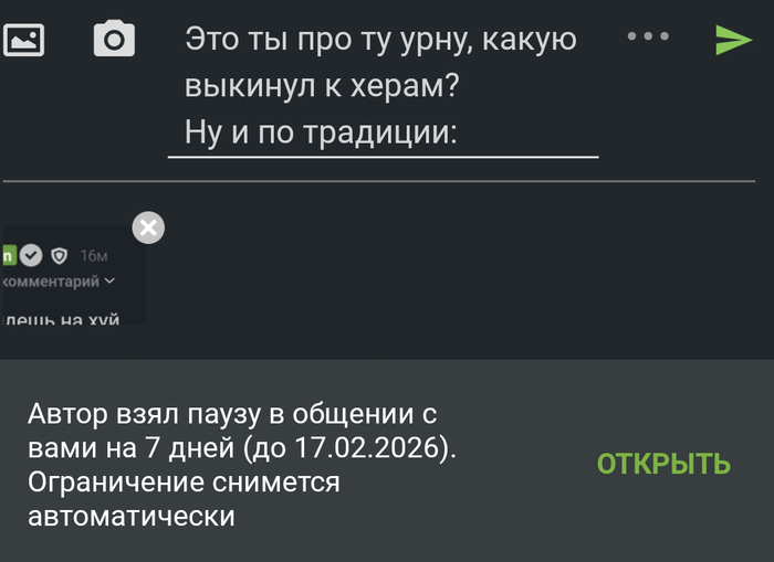 Что ж ты, чудо зелёное, как ссыкло детсадовское себя ведёшь? Твои же слова тебя обижают, а, @chistomen,? Ну мне не лень, я и постом отвечу... Твоими же словами.