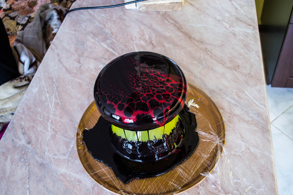 Поздравляю! Вы приготовили свое первое белое Нечто. Вытаскиваем с морозилки, снимаем форму, вытаскиваем все это и ложем на подставку/ровную тарелку (что-то что не удержит все это). Берем поднос или любую емкость большего размера нежели торт. Ставим торт на чашку/миску (чтобы приподнять над емкостью). Поливаем все это кровью недавно убитого врага/кровью девственницы (зеркальная глазурь). Ниже, юные подаваны, я расскажу Вам как ее приготовить.