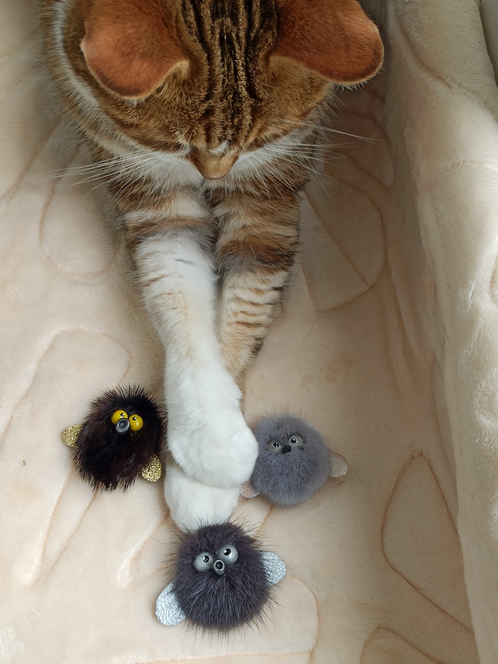 Мухи около 5 см, сделаны из норки, фетра, кожи, пластика. Все хоть и достаточно изящно, но крепко и надежно, если использовать по назначению.