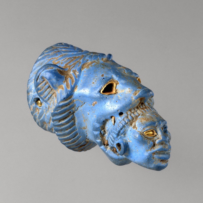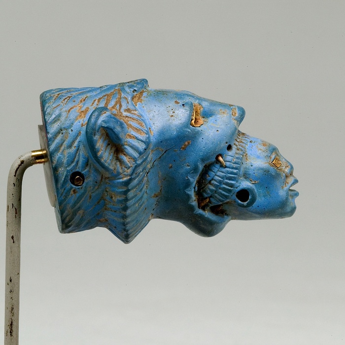 Ручка от мухобойки. Высококачественный стекловидный фаянс, золото. Эпоха Рамсеса II. Из Пер-Рамсеса (Кантир). 13 в. до н.э.Длина: 4,3 см; высота: 3 см.Ранее – собрание Норберта Шиммеля. Перед вами редкий памятник - ручка от мухобойки. Она изображает льва, поедающего поверженного нубийца. В Египте фараонов Нубия, с одной стороны, была источником золота и редких материалов, с другой – ассоциировалась с постоянной смутой, которая противостояла Маат – миропорядку и гармонии.Лев в египетском искусстве символизировал фараона, утверждающего Маат и принуждающего восставших из окружающих земель к покорности.Памятник выполнен из высококачественного стекловидного фаянса. Глазницы льва и нубийца содержат золотую основу для инкрустации – изначально предмет был очень ярким и эффектным. Также из золота были сделаны клыки льва. Отверстия в шее льва сделаны для шнурка, за который подвешивали мухобойку. Сама мухобойка, чаще всего делалась из конского или ослиного волоса, могла быть и из растительного материала; мухобойки такого типа, с простой ручкой, и сейчас используются в деревнях Верхнего Египта.Нью-Йорк. Музей Метрополитен.(с) текст: Виктор Солкин.(с) фото: Владимир Ставицкий.