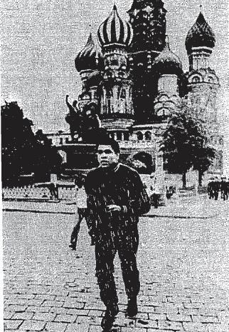 Среди встречавших Али все же был один боксер – знаменитый Виктор Агеев. Вот его рассказ об их встрече и фотография Агеева с Али, только дата визита неверна. Вечером того же дня Али пошел в цирк. Юрий Никулин представил его зрителям и подарил ему букет роз; во время антракта Али раздавал автографы, и потребовалось вмешательство милиции, чтобы все расселись по местам и представление могло продолжиться. На следующий день Али встал в 6 утра и пробежался по Красной площади: