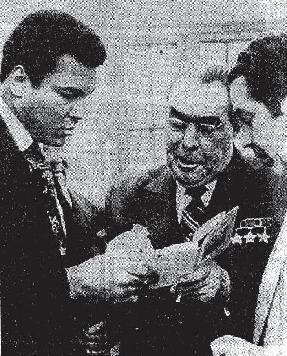 А затем Мохаммед отправился в Центральный институт физкультуры и поспарринговал с ребятами. Стоявшего рядом Игоря Высоцкого выпихнули в ринг; они разделись до пояса и покружили в ринге один раунд, обозначая удары. Дальше Али закатил речь: — Я как-то видел, как боксирует Стивенсон. Он – отличный трехраундовый боксер-любитель. Он был бы опасен пару раундов, а в третьем я бы его нокаутировал! Но если бы я с ним встретился на Кубе или в СССР, я бы, возможно, дал ему выиграть, а вот уехав оттуда, я бы его нокаутировал. — Да, на всякий случай, если у меня возникнут проблемы с отъездом, я сюда захватил своего адвоката. После Москвы Али поехал в Ташкент и Самарканд; см. фильм ниже. По возвращении в Москву Мохаммед Али был 19 июня принят Брежневым в Кремле; они расцеловались, и затем 35 минут говорили о мире во всем мире. Али был очень впечатлен, о чем и говорил потом в многочисленных интервью. На память о встрече Леонид Ильич вручил Али экземпляр «Малой земли» с автографом и часы. На пресс-конференции после их встречи очарованный СССР Али заявил: — Трудно поверить, что такая мирная страна хочет войны. И Брежнев – я никогда не думал, что он такой тихий и спокойный человек. Сложно представить, что он может быть зачинщиком войны. — Я здесь ни разу не видел человека, голосующего на дороге, и я не видел ни одного нищего или просящего милостыню. Я никогда себя не чувствовал в такой безопасности, никакого риска быть ограбленным. Мне сказали, что в этой стране нет свободы вероисповедания, но здесь свободно молятся мусульмане, христиане и евреи; я думаю, что отношения между нашими народами плохи лишь из-за лживой пропаганды.