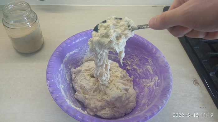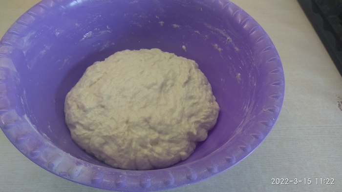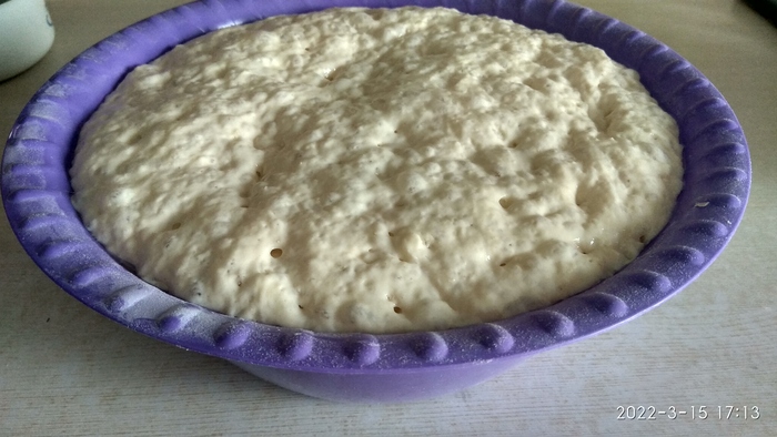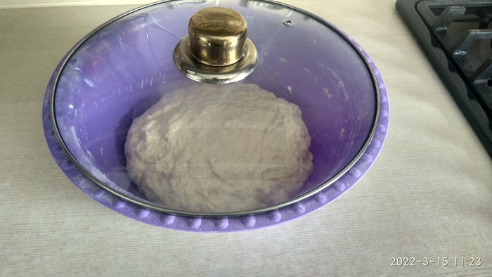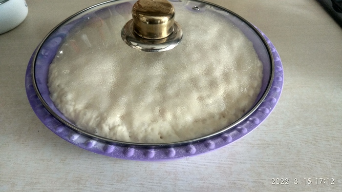 Почти всё. Теперь оставляем тесто в покое и тепле, подходить. На фото видно время, но это всё индивидуально. Как крышку начнёт поднимать, так пора.