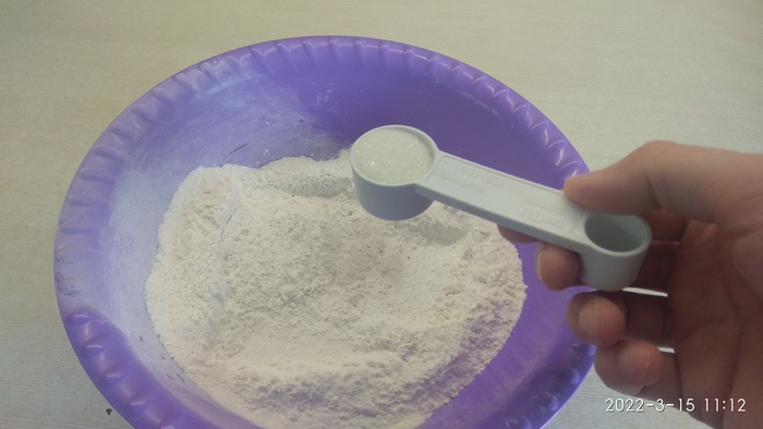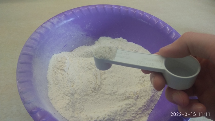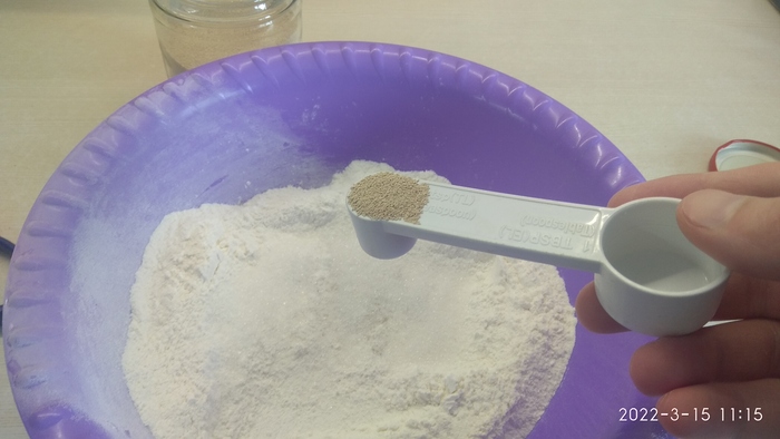 Мерной ложкой добавляем чайную соли, чайную дрожжей и столовую сахара.