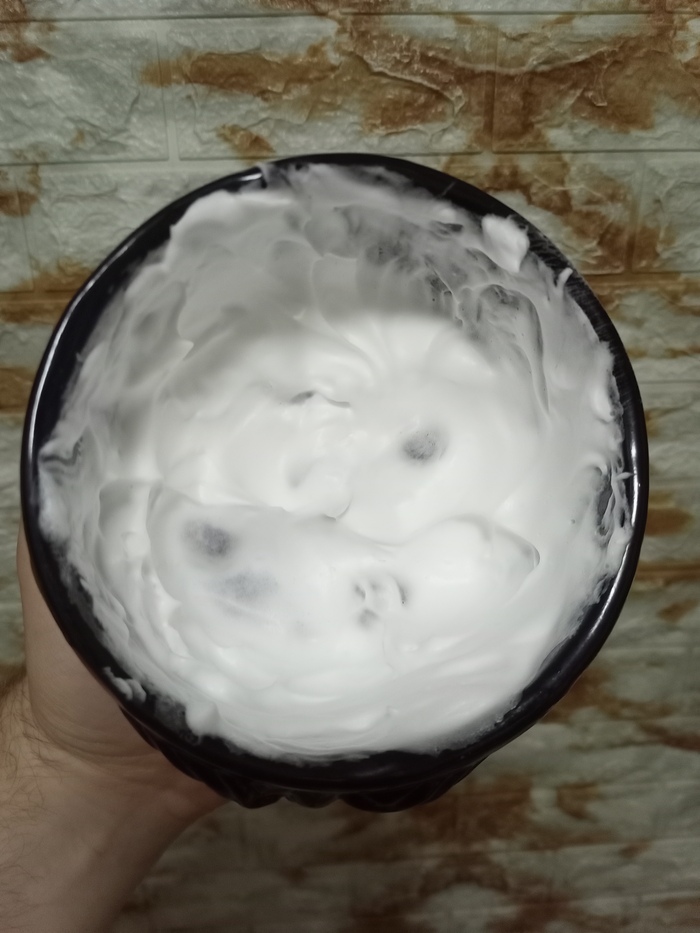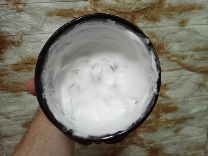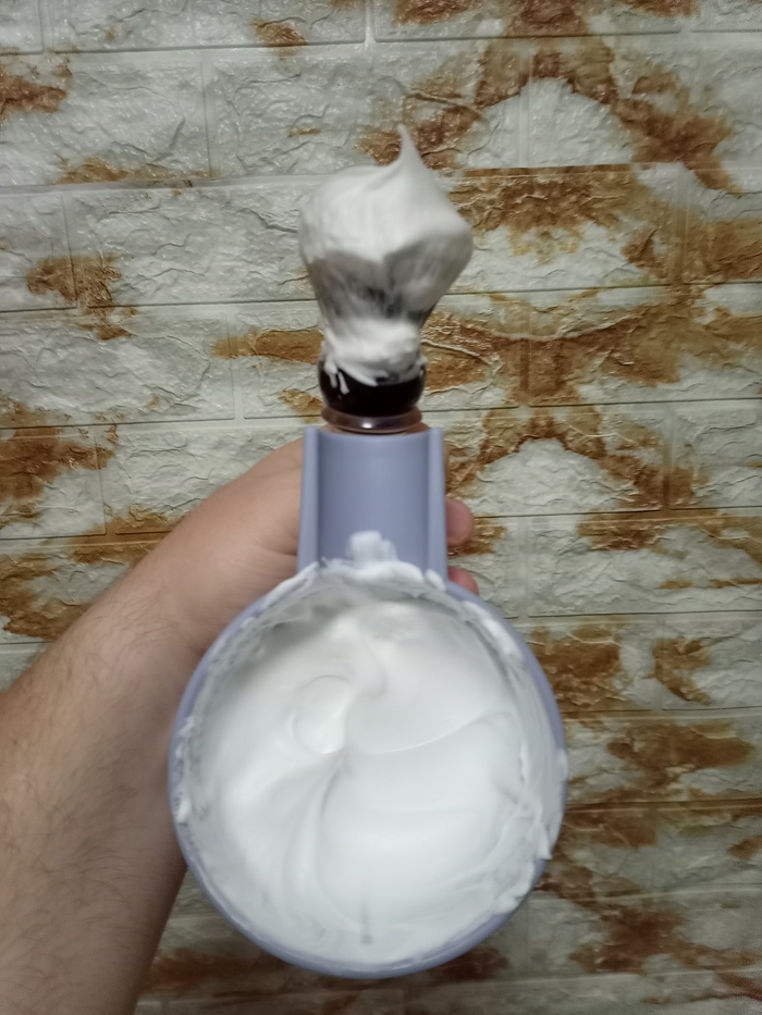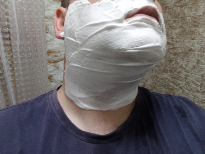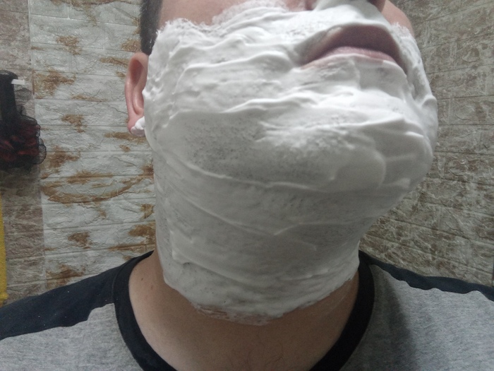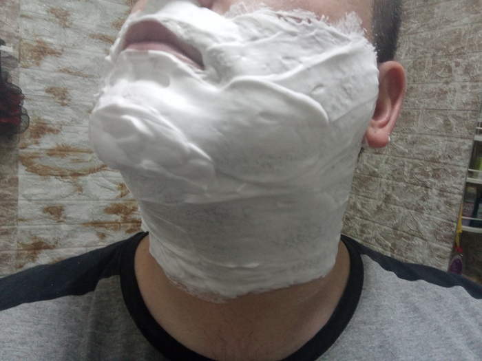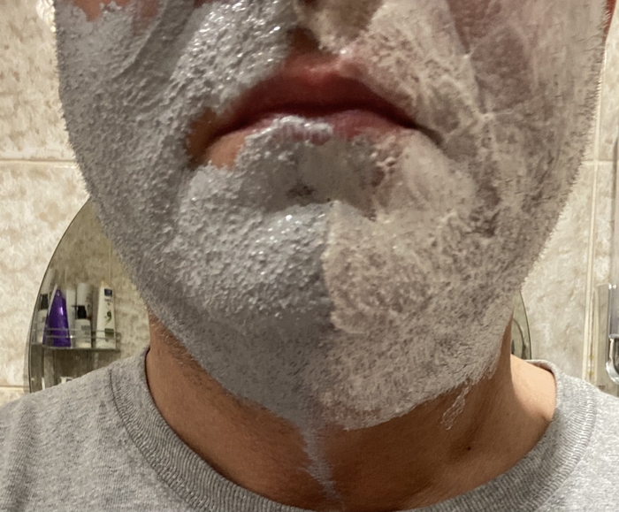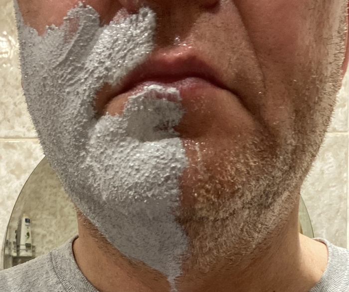 Затем решил сравнить Stylist Pro и балконную пену, но которая используется в связке с косметическим маслом (жидкий ланолин) в качестве прешейва. Т.е. распарил лицо, нанес на половину лица масло и поверх масла нанёс пену.