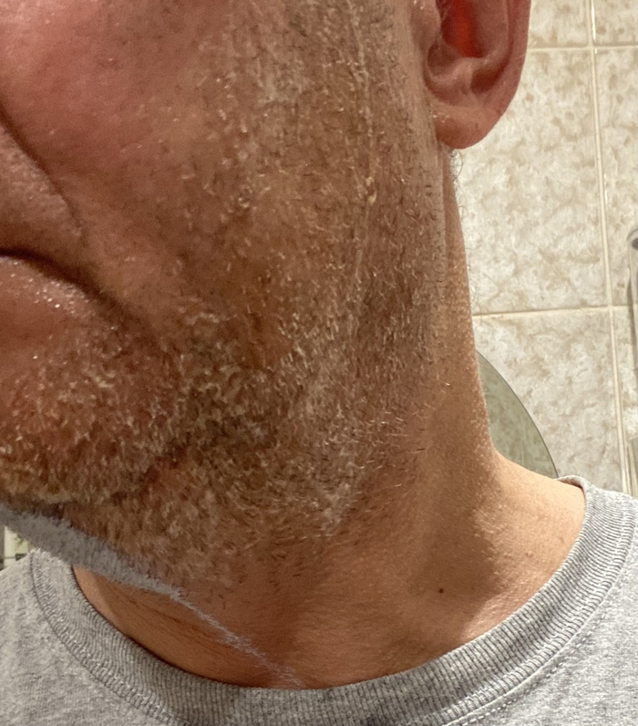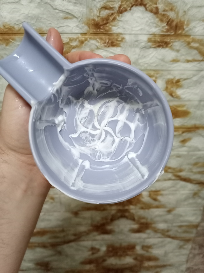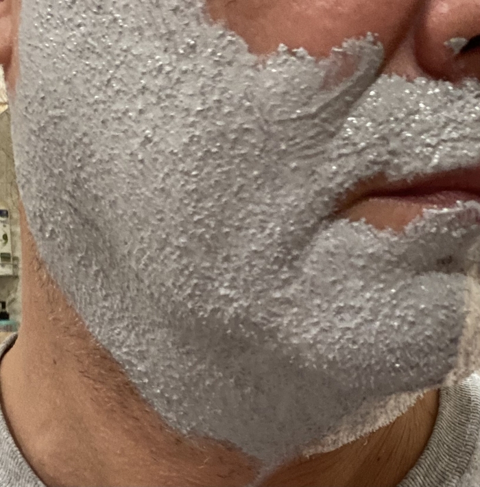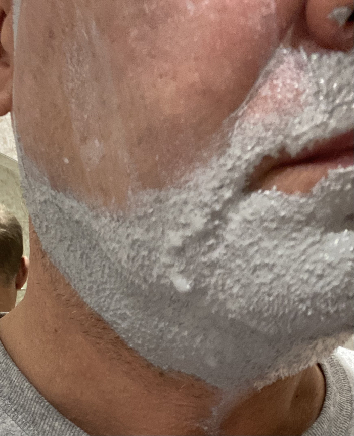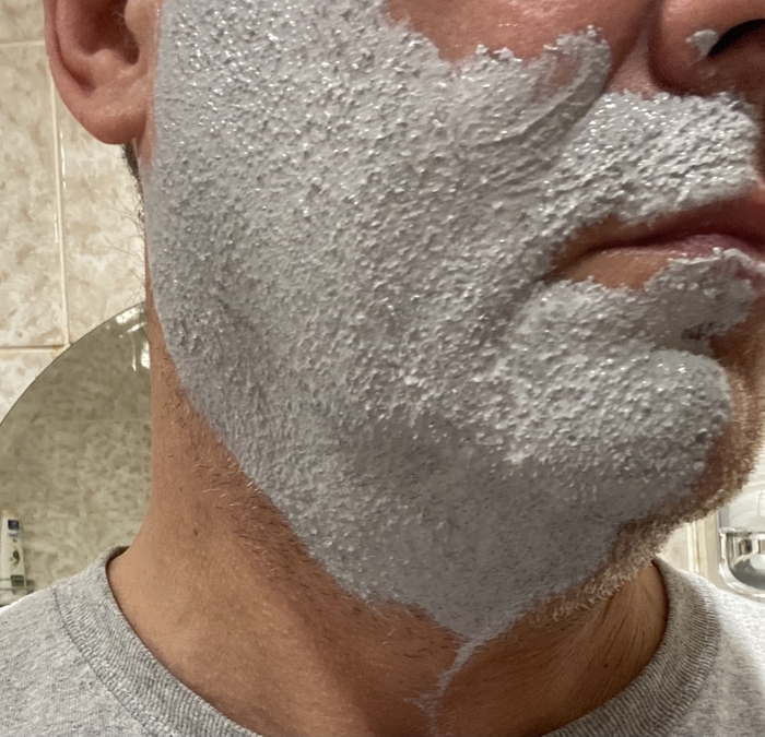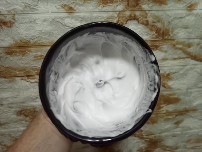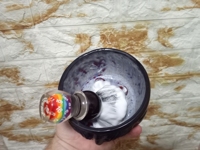Затем решил сравнить Stylist Pro и балконную пену, но которая используется в связке с косметическим маслом (жидкий ланолин) в качестве прешейва. Т.е. распарил лицо, нанес на половину лица масло и поверх масла нанёс пену.