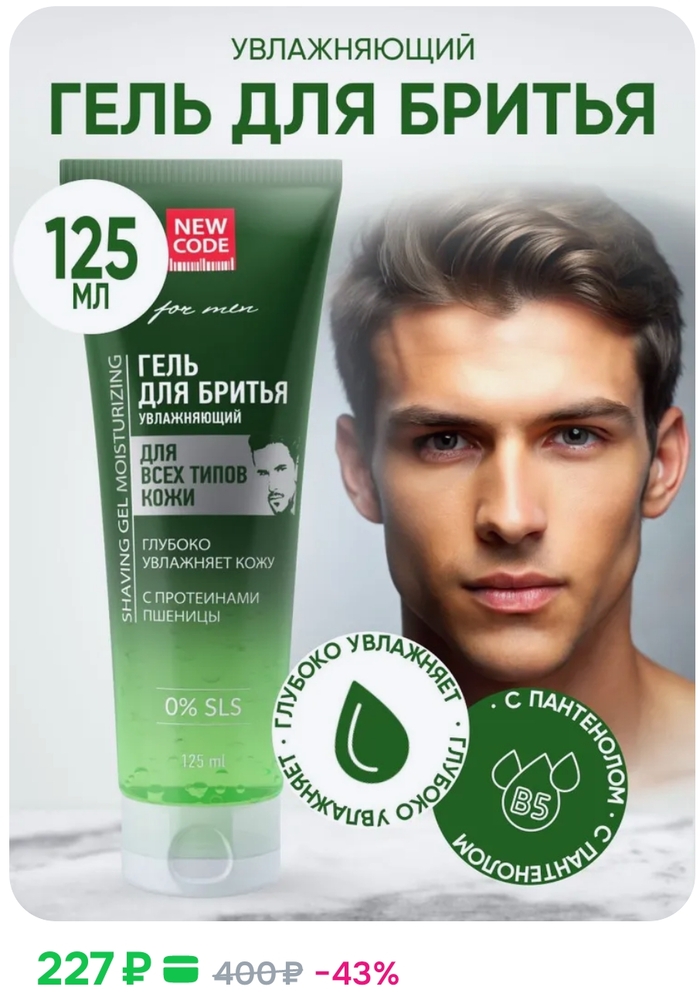 Первым гелем был гель от бренда Natura Siberica. Вышел около 360₽ за 200мл (так же 1.8₽ за 1 мл, как и у New Code). Иногда пользуюсь их гелем после бритья под названием "Як и Йети" и он радует (цена низкая (если попадать на скидки), не жирнит кожу и не оставляет плёнку, имеет легкий аромат ментола и дает коже приятный холодок). Вот недавно они стали выпускать и гель для бритья (раньше выпускали какую-то "глину для бритья"😁, но её не пробовал).