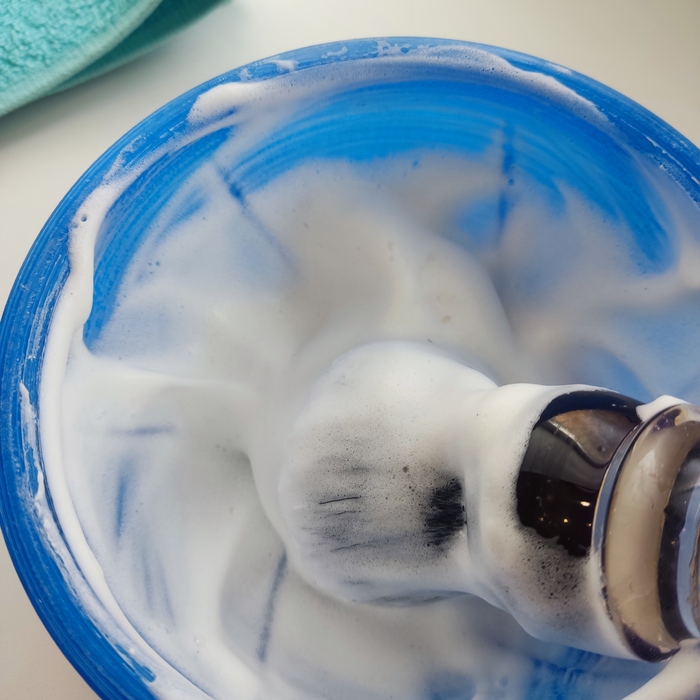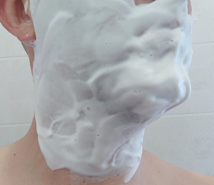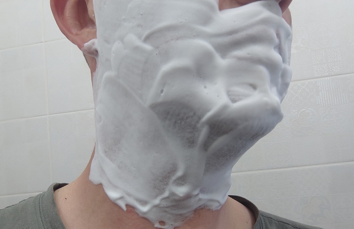 Пена вышла шикарная. Низкая, плотная, жирная и густая, такое впечатление, что наносишь жирный, взбитый крем. При этом воды я бахнул прилично.