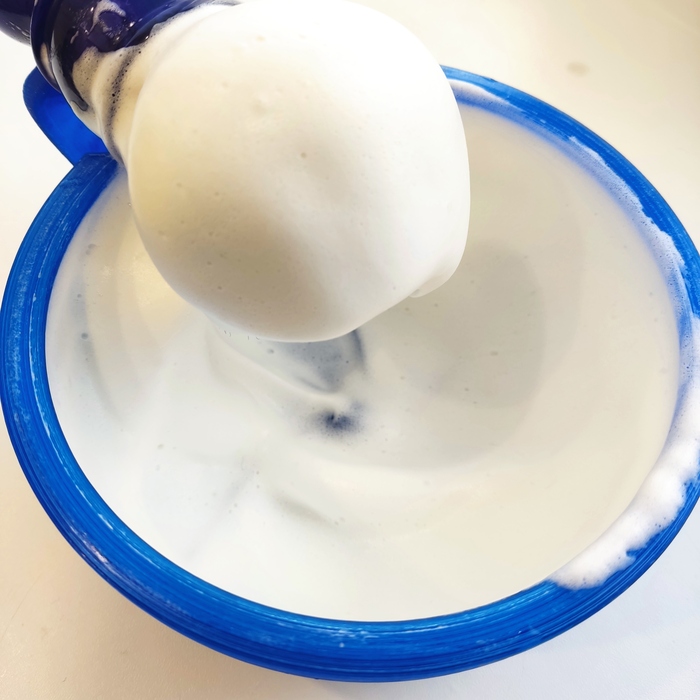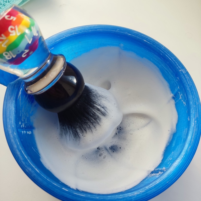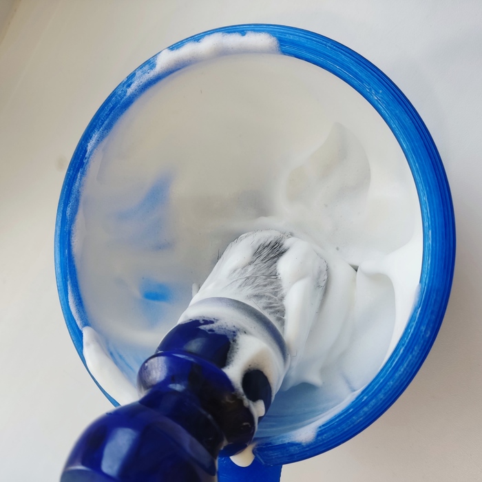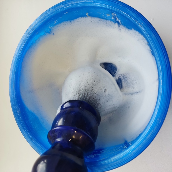 Пену взбивал в чаше, размяв в нём примерно 1,5-2 грамма мыла. Также замочил его минут на 5. Пена взбивается очень легко, получается очень плотной, густой, тягучей и довольно низкой. Так как я люблю пену пожиже, воды добавлял немало, но это никоим образом не сказалось отрицательно на его свойствах.