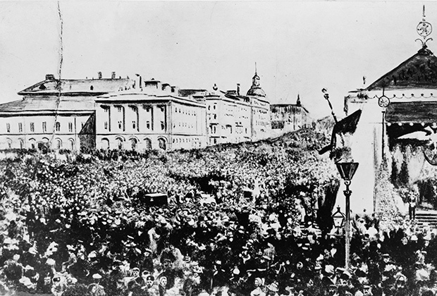 Толпы на улицах Москвы празднуют отмену крепостного права, 1861 год