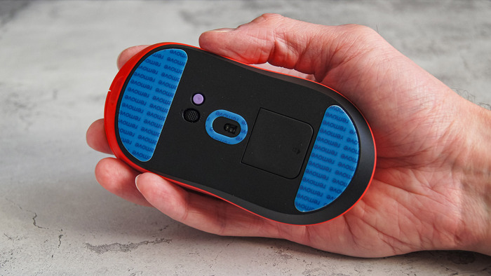Взглянув на «брюшко» манипулятора, подтверждается догадка о том, что оно черного цвета. За скольжение отвечают две массивные ножки из PTFE (тефлона), дополненные небольшим глайдом-кольцом вокруг линзы сенсора.