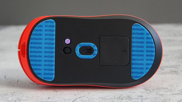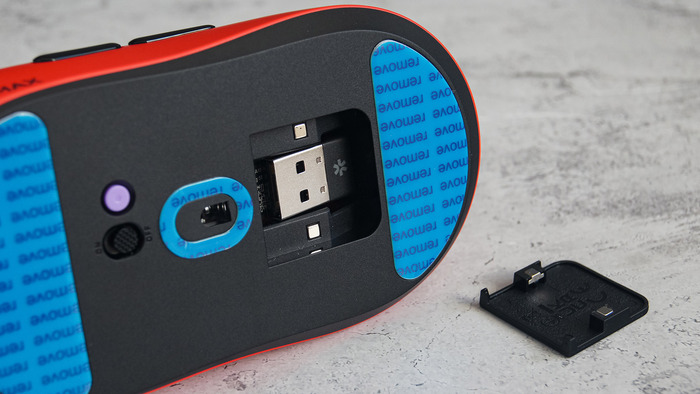 Слева предусмотрен технический отсек с магнитной фиксацией крышки — здесь можно хранить USB-ресивер при переноске. Интересная деталь: при первой распаковке вы обнаружите адаптер не внутри мыши, а в отдельной нише упаковочной коробки.