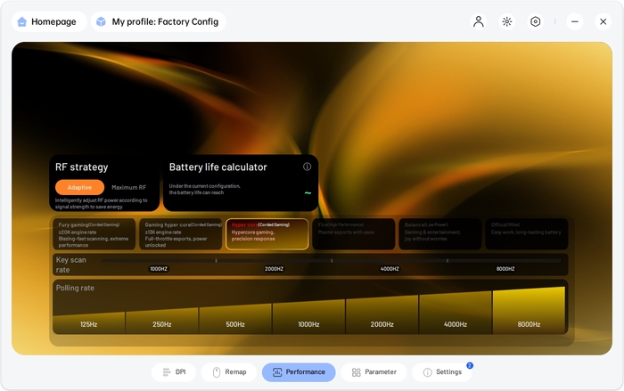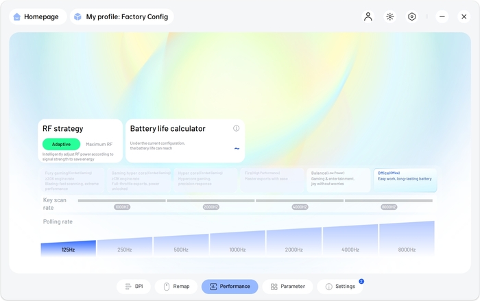 Особого внимания заслуживает функция адаптивной частоты опроса. Это «умная» стратегия энергосбережения: в моменты низкой активности мышь автоматически снижает «герцовку», а при резких движениях и в пылу сражения мгновенно разгоняет ее до установленного вами лимита. Пользователю доступно семь ступеней частоты — от стандартных 125 Гц до экстремальных 8000 Гц.