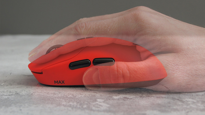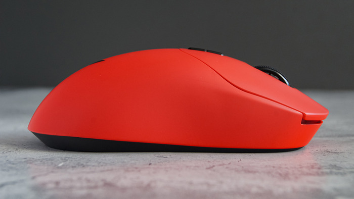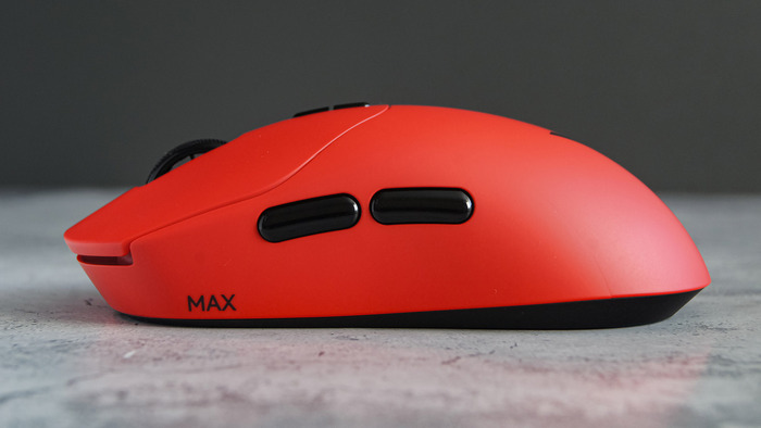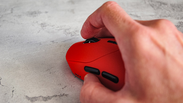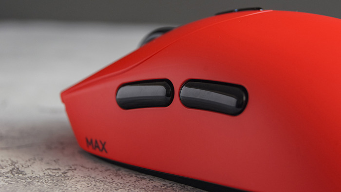На левой грани традиционно для мышей подобного класса расположился дуэт кнопок листания. Они выполнены из глянцевого пластика и заметно контрастируют на фоне красного матового корпуса.