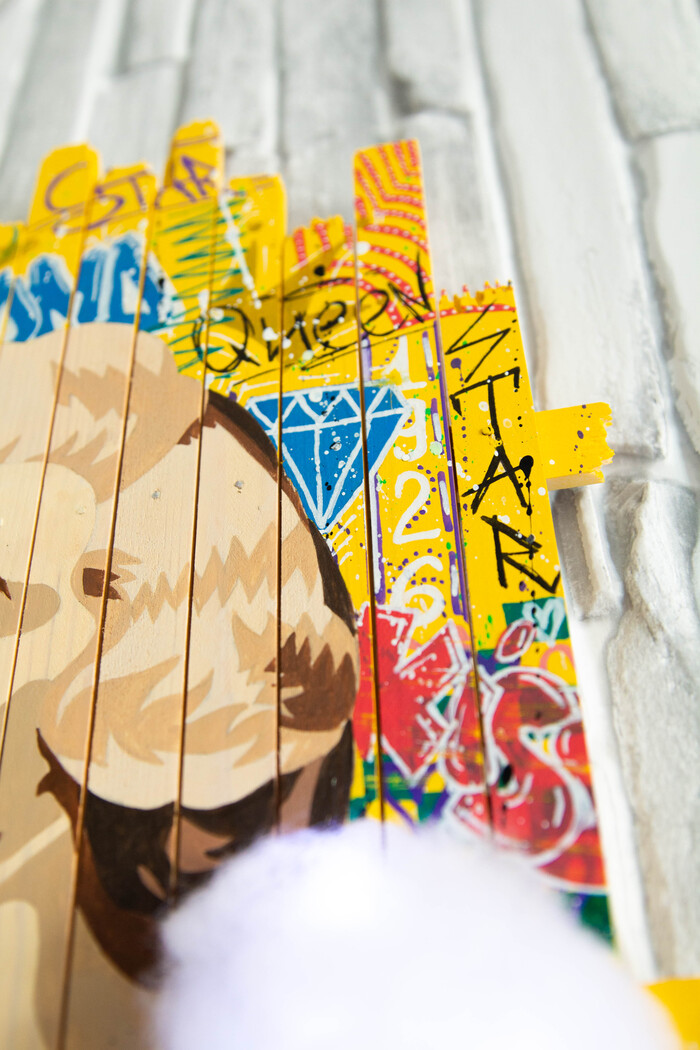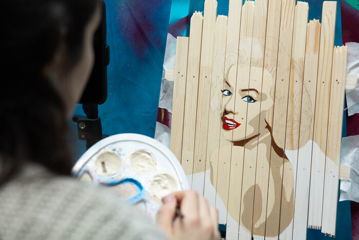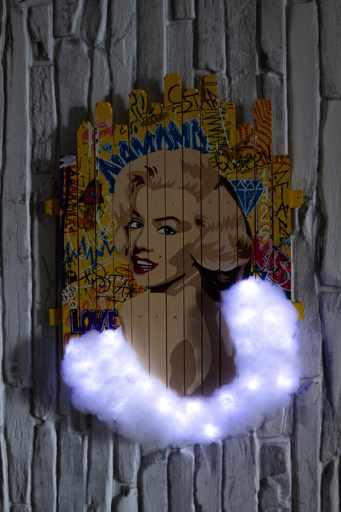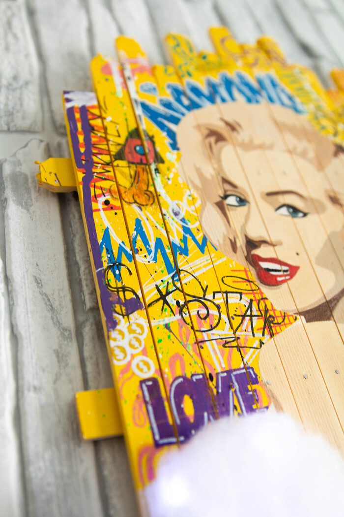 Работа выполнена в стиле поп-арт с элементами граффити. Стиль характеризуется смелым использованием цвета, коллажем и узнаваемым образом Мэрилин Монро, который интерпретируется в современной, дерзкой манере.