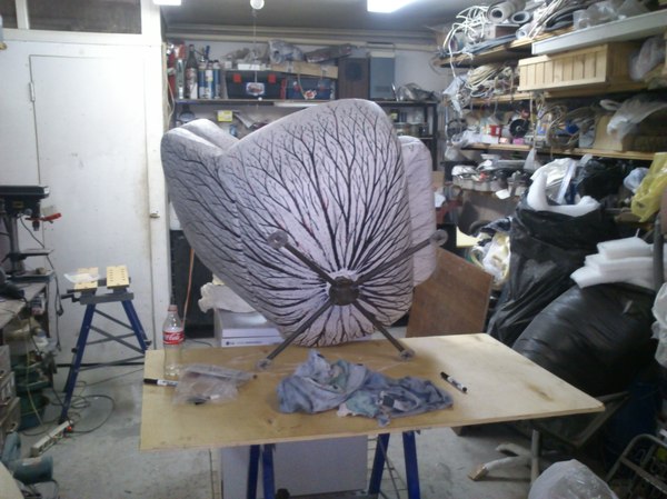 Чтобы как то привязать расположение изображения обивки к 3д модели, пришлось сначала нарисовать ветки на кресле вручную. Потом снял ткань и отсканировал ее. Потом наложил скан на выкройку. Потом скан распечатал на мебельной ткани.