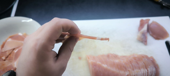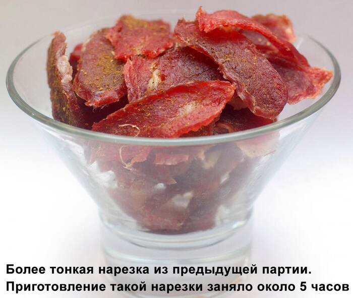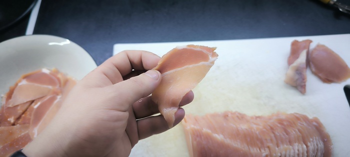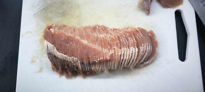 Нарезаем на желательно ровные слайсы одной толщины, перед этим рекомендую заморозить, чтобы не было проблем с нарезкой, но я конечно же этого делать не стал и у меня получились уроды :D