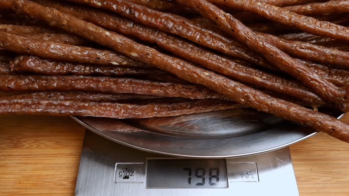 В идеале пару дней высушенным чипсам надо полежать в холодильнике, чтобы "дозреть". Выход примерно 50% от первоначального веса мяса. Даже, если посчитать себестоимость, выходит выгоднее, чем покупать в магазине.