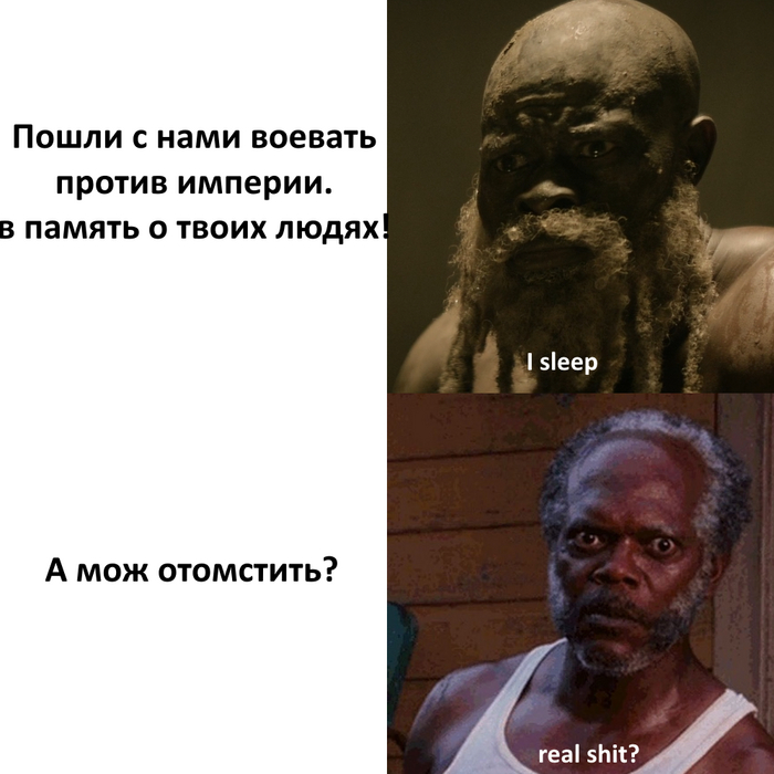 Остается ещё один участник кардебалета - а именно та самая армия мятежников, которую фермер, пошедший с Корой, хочет уговорить пойти в атаку. Знаете как? Буквально: "Ребят ,мы вам тут год назад зерно продали, а теперь нас хотят убить имперцы из-за вас, ну мы и подумали, что вы впишетесь". Местные мятежники, прямиком из южного галактического централа, говорят, что это все буллщит, и они просто купили зерно, а воевать с дредноутом - она не ебланы.