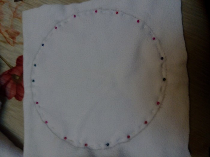 так как для шитья у меня нет выкроек, кроме примеров из инета, то я всё делаю на коленке при помощи английскиих? французских? булавок, короче) разметила квадрат с припуском, потом круг)