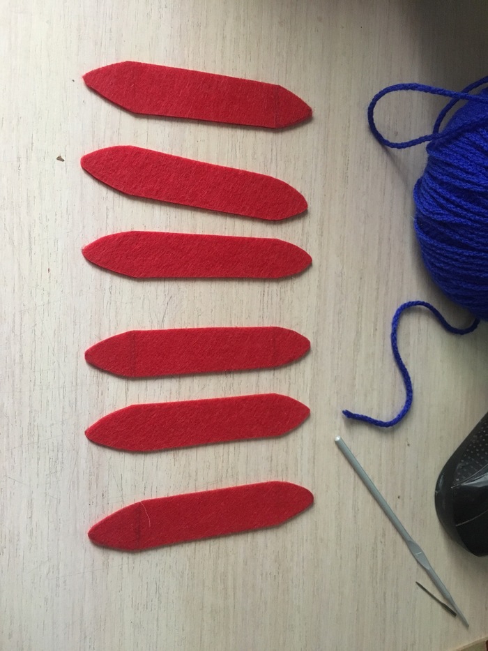 Вырезаем заготовки из фетра. Размер 2*11. Их нам нужно 7 штук. Пришиваем.