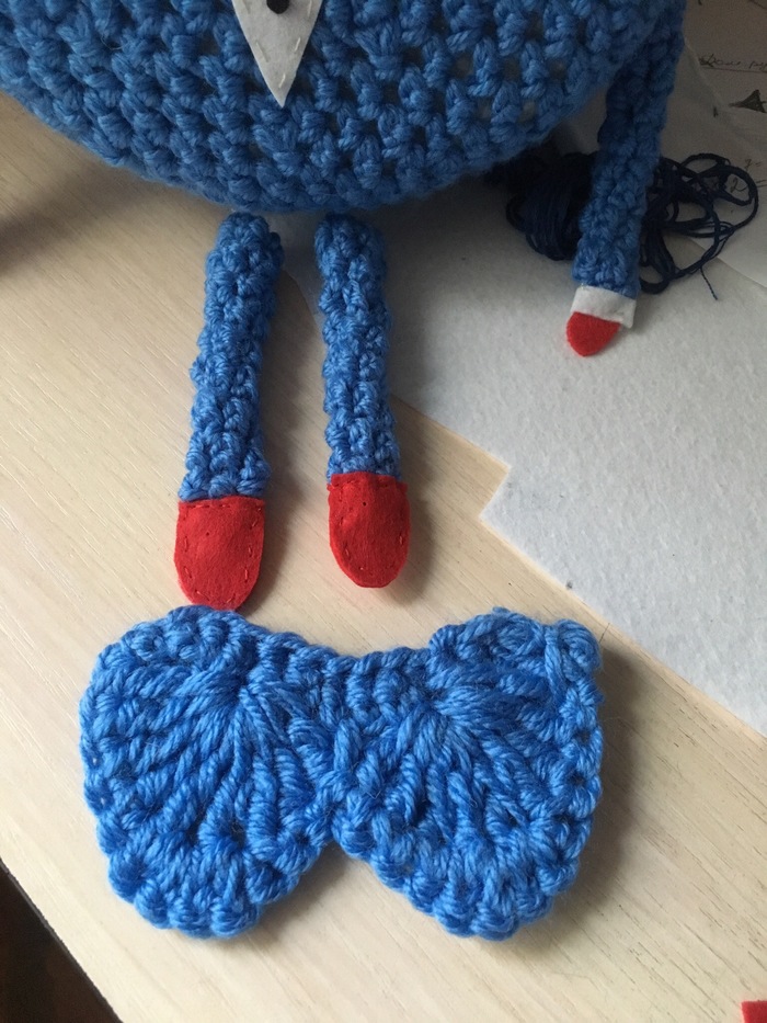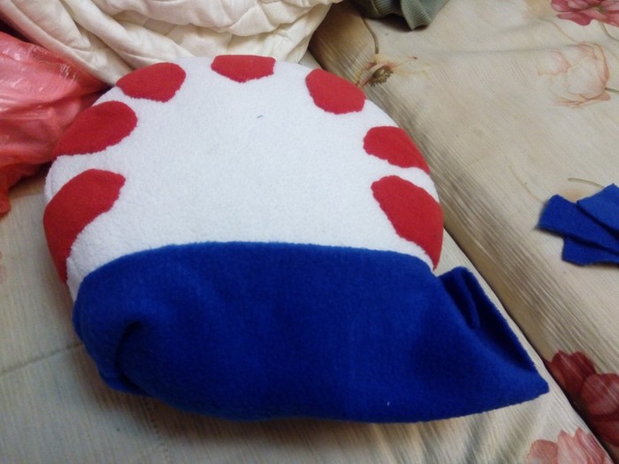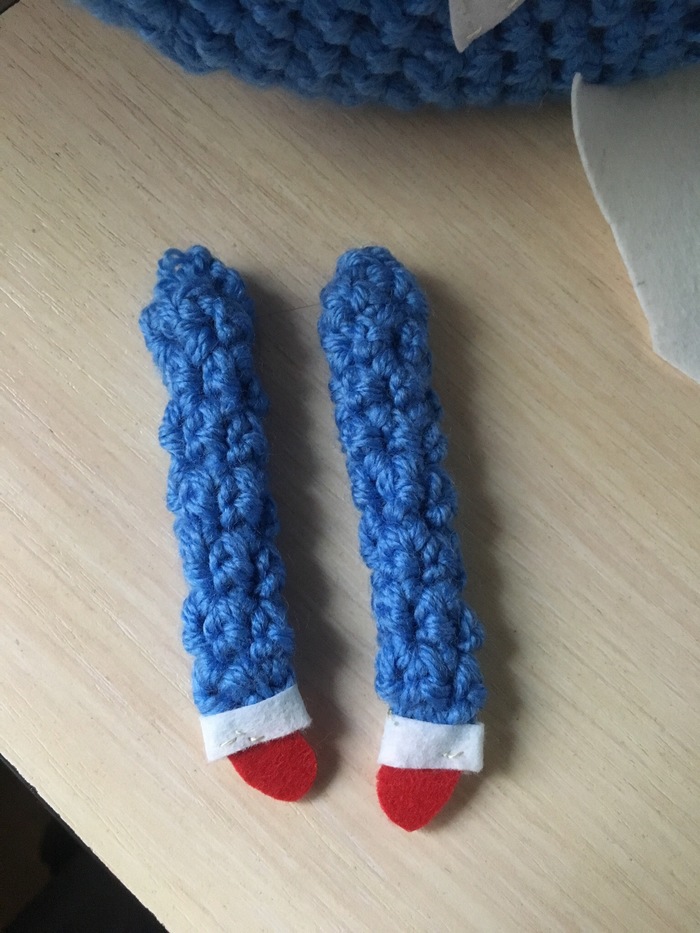 ноги вышли мне в почти 3 часа возни, потому что сначала я их сделала длинной с руки, а когда стала прилаживать, оказалось, что не смотрится и нужно их сделать немного длиннее. синего флиса к тому времени осталось без права на ошибку, так что я шила ноги не дыша просто) к счастью, всё вышло отлично. ботиночки сначала сделала классическими, но мне не понравилось, поэтому сделала их культями, как и руки.