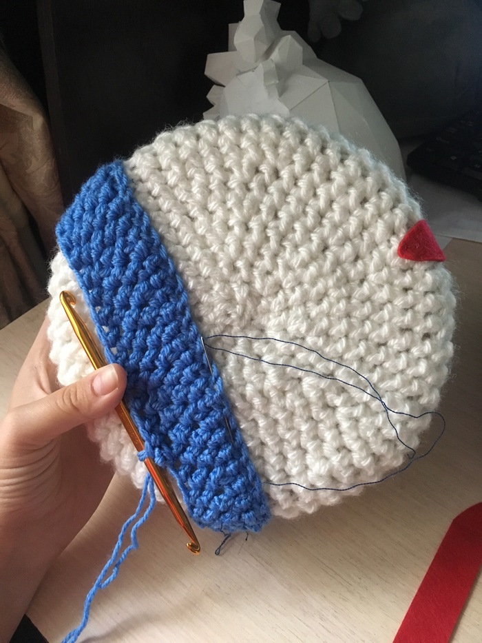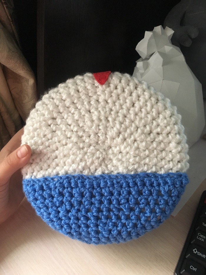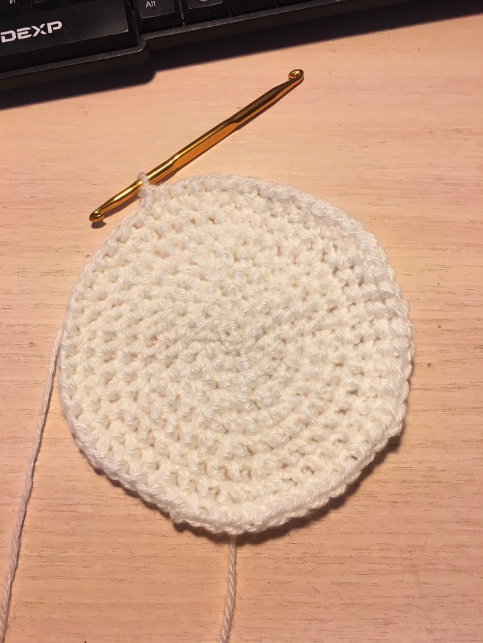 Вяжем спину. (Круг такой же по диаметру, как и передняя часть), соединяем швом и забиваем.