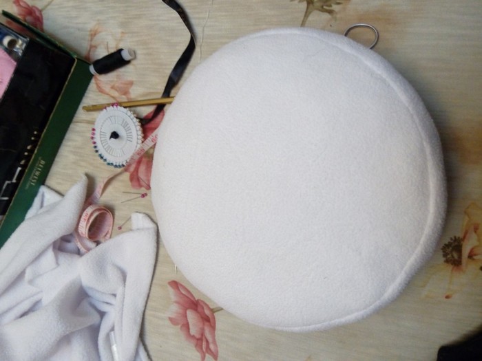ленту между частями круга, чтобы тело был не плоским, вырезала на глазок. набивала холофайбером из старой подушки