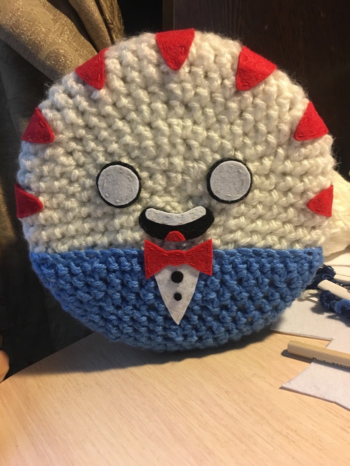 Продолжаем вязать боковину столбиком. Из картона вырезаем круг такой же по диаметру, как и передняя сторона и вставляем в заготовку. ( Это необходимо, чтобы наша игрушка не поплыла при сборке.) Такую же заготовку мы будем подставлять к спине Лакея.