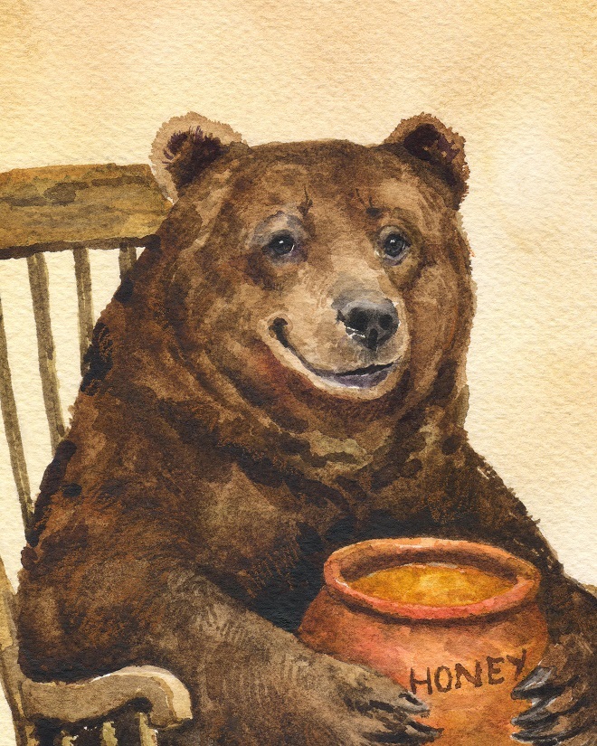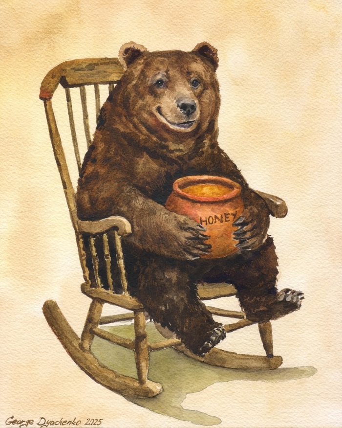 Акварель с довольным мишкой, у которого есть горшочек мёда 2025г