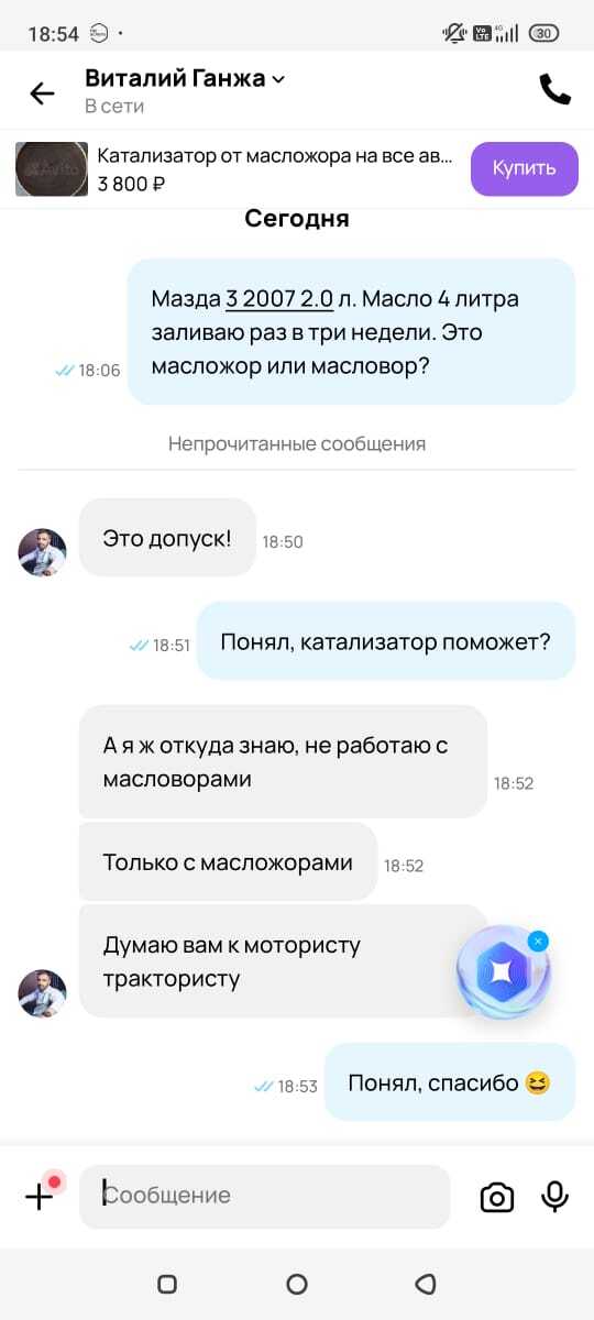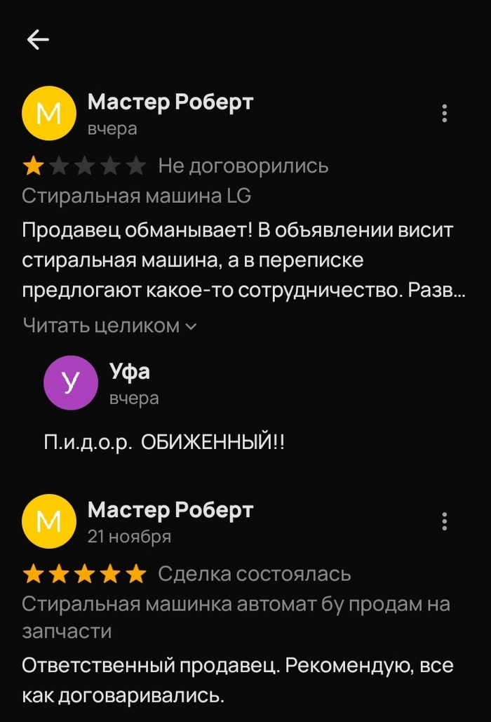 Пишу отзыв этому продавцу, естественно не могу поставить 1* , а только отзыв без оценки тк у нас была только переписка, а вот тут и кроется секрет почему у продавца только переписка! Если бы был звонок то можно поставить отзыв с 1* с отображением в профиле тк никто не знает о чем вы разговаривали по телефону, а вот если я поставлю 1* и укажу что был договор о встрече, то "прокладка" сможет доказать перепиской Авито, что небыло договорености и 1* уберут из профиля. Помимо этого "прокладка" просто может в ответе написать матерные слова просто поставив точки между букв. Позор Авито! Написал жалобу, но безрезультатно, по факту никто не продает стиральную машину, а занимается саморекламой, что запрещено правилами авито, так еще и обматерили в ответе на отзывы, просто сказка какаято! Кстати город Уфа, можете найти объявление и поприветствовать эту "Прокладку"!)))))