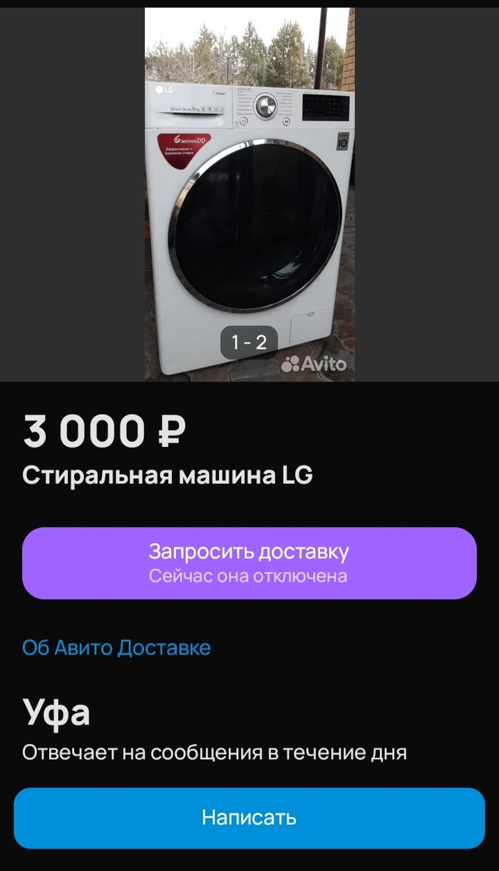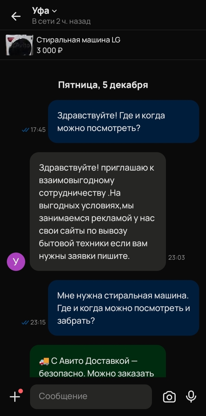 Я занимаюсь ремонтом стиральных машин и иногда выкупаю стиральные машины под ремонт или на запчасти так сказать. Естественно основная площадка для поиска это Авито. И вот в один прекрасный день появляется объявление о продаже стиральной машины LG с неисправностью подшипников. У продавца связь только в переписке( позже поймете почему только так); пишу продавцу стандартную фразу где и когда можно посмотреть и забрать?! И получаю такой ответ: