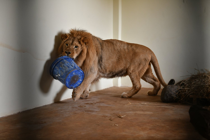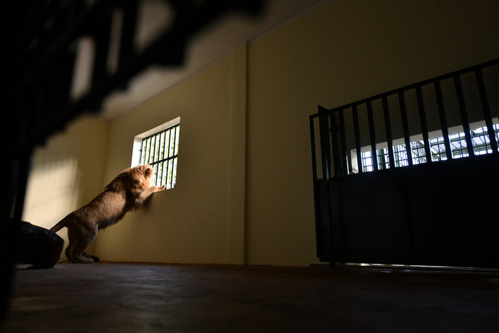 Симба перед выпуском из внутреннего помещения в свой новый дом – просторный вольер
