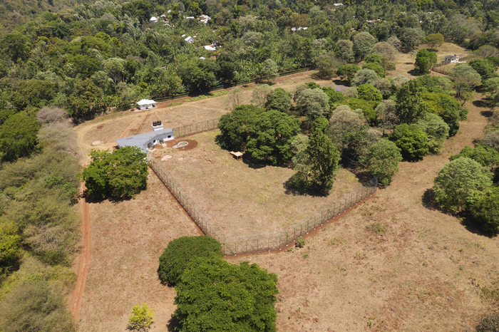 Вольер Симбы в центре реабилитации животных Kilimanjaro Animal Crew. Слева домик для охраны, правее Симба Хаус. В вольере виден пруд и платформа для лазания