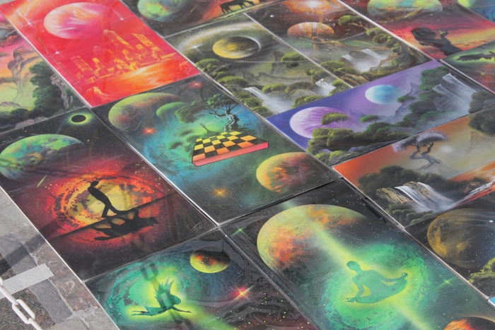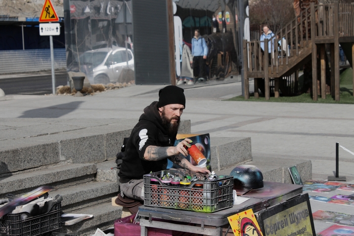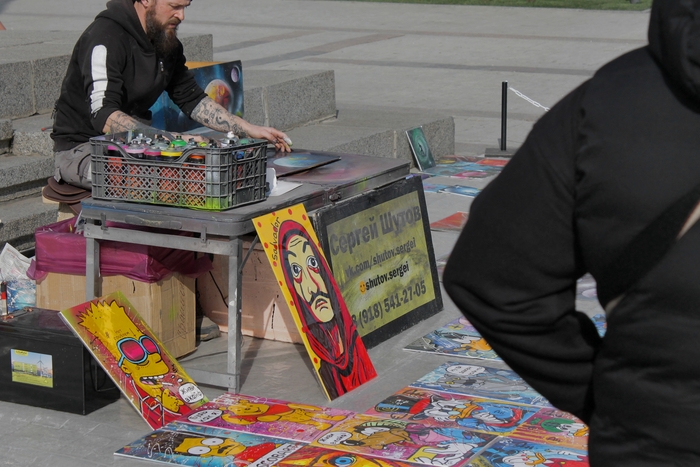 Дойдя до бюста Ушакову, развернулись в обратную сторону и дошли сначала до художника Сергея Шутова, который виртуозно создаёт удивительные картины с помощью аэрозольных баллончиков.