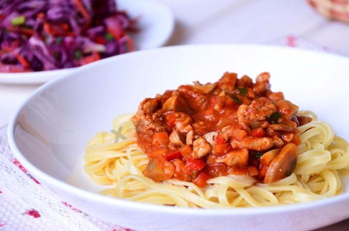Докидываем помидорчик к курице и тушим еще немного. Перед подачей варим макароны (слегка недовариваем, помним про сопли!), выкладываем на тарелку, сверху пару ложек томатного соуса с курицей. Можно ветку травы для красоты воткнуть.