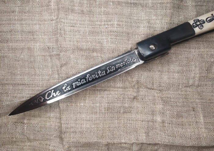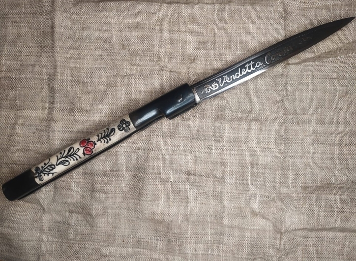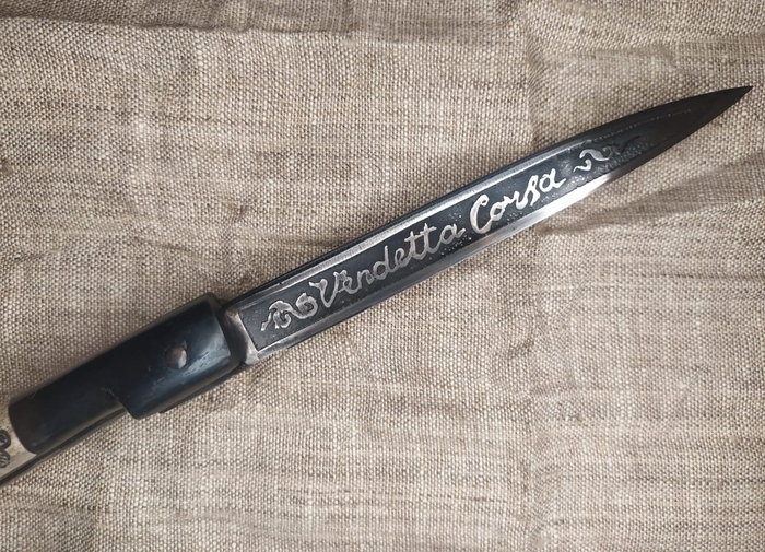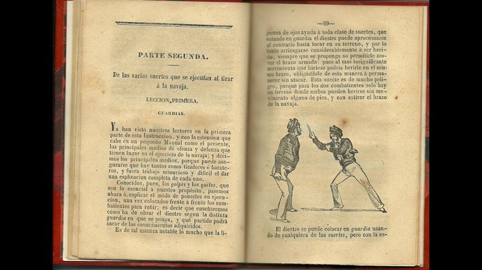 Теперь о рукояти. Ну во-первых, такая вот «пистолетная» форма рукоятки навахи-бандольеро способствует полному закрытию режущей кромки широкого лезвия, кончик острия которого «вздёрнут» вверх. Во-вторых, «пистолетная» форма задней части рукояти была удобна для изуверского проворота ножа в ране поверженного противника (вспомним некоторые современные отвёртки с Т-образной рукоятью). И, наконец, в-третьих, такая рукоять была удобна для удержания навахи, так как удлиняла её при тычковом фехтовальном ударе. В том числе и о таком способе удержания навахи упоминали тогда в своих трудах некоторые современники-фехтовальщики . В защиту столько кровавого имиджа этого складного национального испанского ножа можно лишь попытаться сказать, что наваха с одинаковым успехом могла использоваться как для бытовых нужд, так и для защиты от супостата. Ну или для нападения.