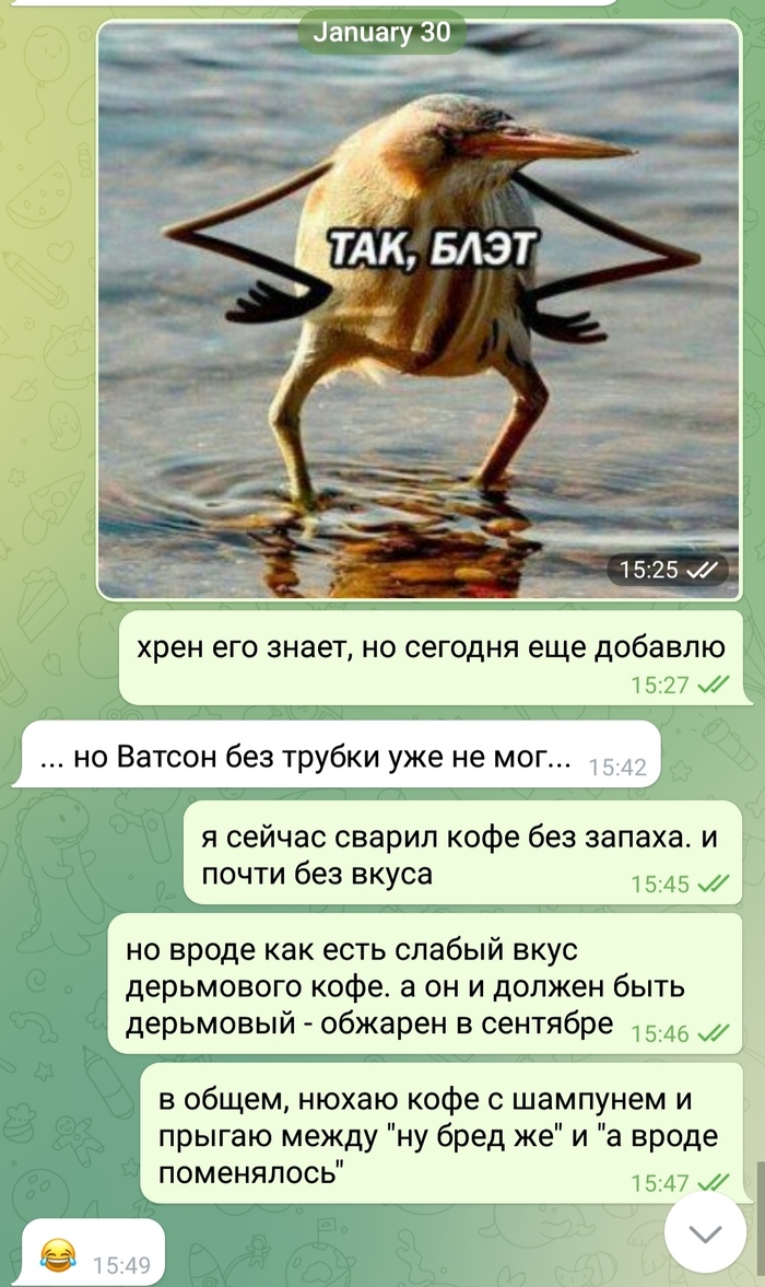 Утром понюхал зерна кофе, ничего не поменялось. Ну штош.. Это ж опыт. А днём зачем-то решил кофе сварить. И вот тут уже молотый кофе был без ковидного запаха (и без нормального запаха тоже). сваренный кофе тоже без запаха и почти без вкуса, но это уже что-то.