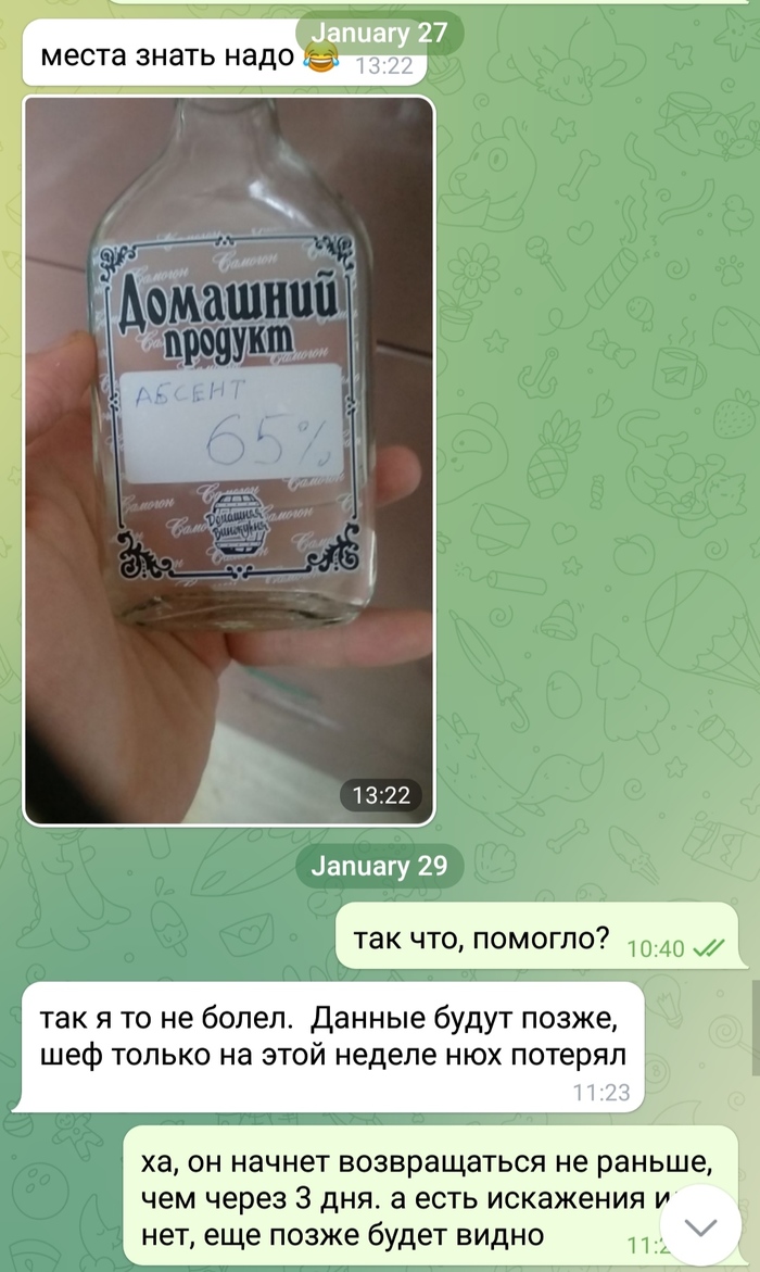Несколько дней назад в ленте проскочил пост о том, что может помочь абсент. Ну, есть и те, кто мочой обливается. Пролистал этот бред и забыл