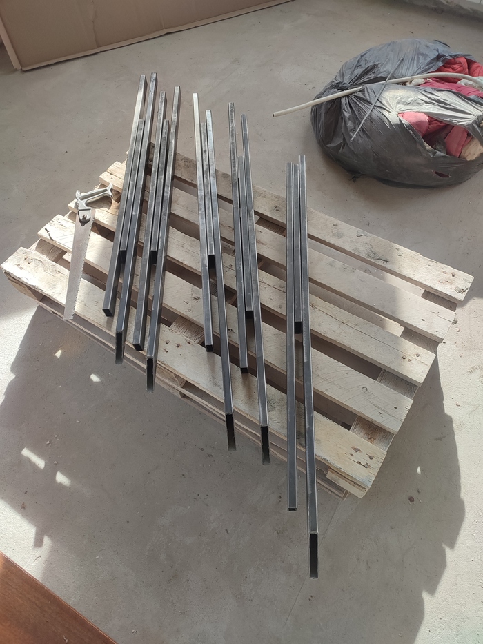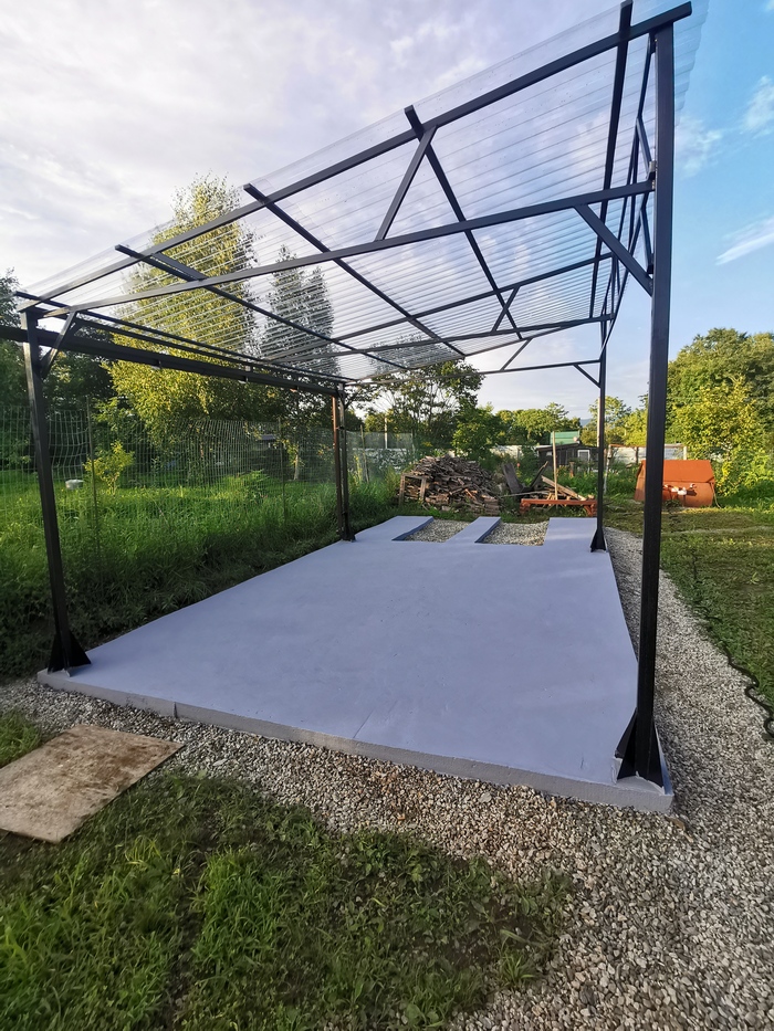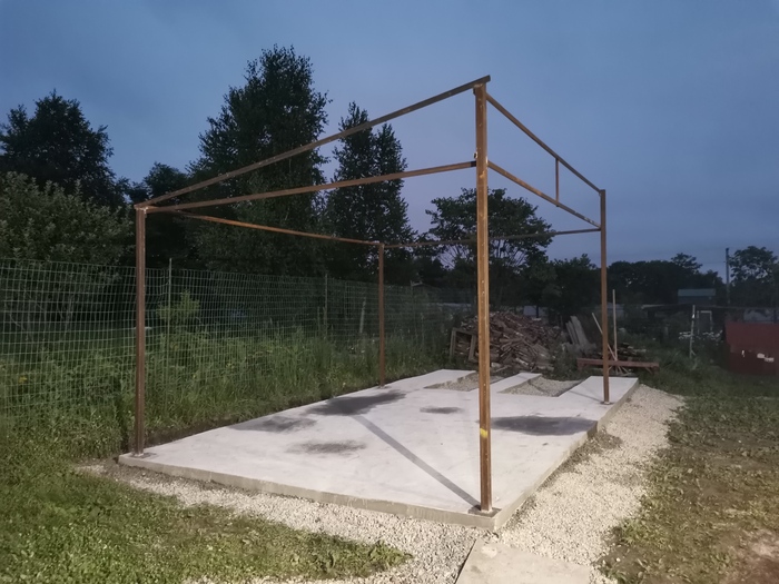 Когда все застыло прошло 7 дней. Снял плёнку. Купил на ушм алмазный диск по бетону и сгладил поверхность. После начал собирать металлоконструкцию. Столбы взял 60х60 помоему 2 мм толщиной. На все остальное профиль 40х20.