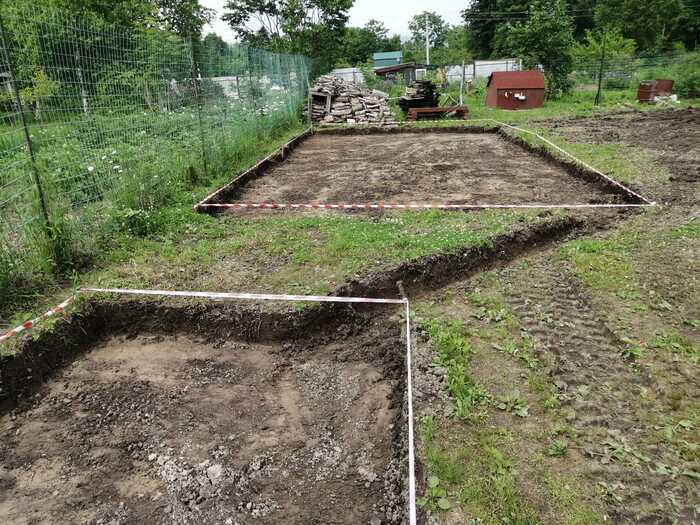 Стройка навеса под бассейн началась в следующем году совершенно спонтанно. Увидел у соседа работающий экскаватор, узнал что он с нашего СНТ и берет 1500 за час работы без всякой доставки на место. Здесь и началась бурная деятельность. Разметка участка где будем копать место. Заодно разметил место под мангальную зону.