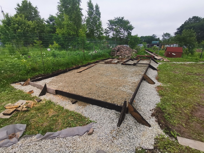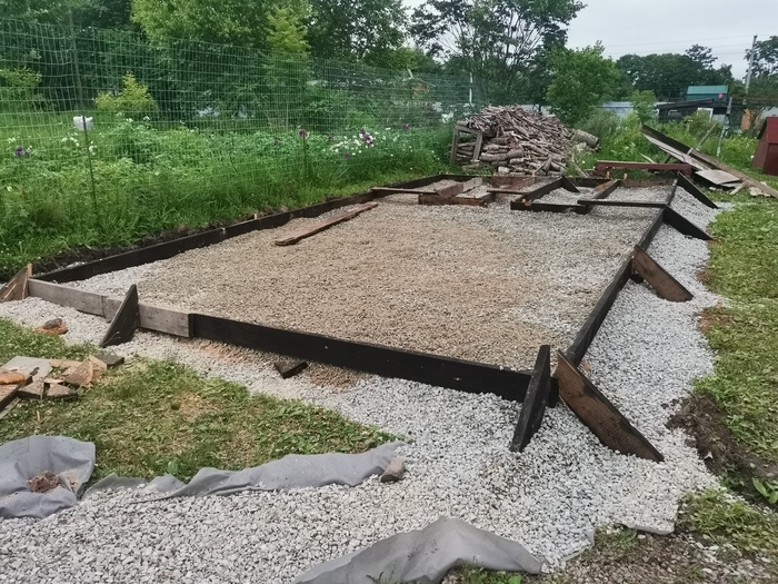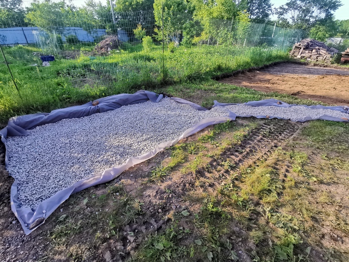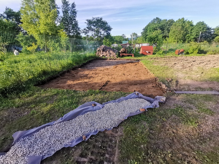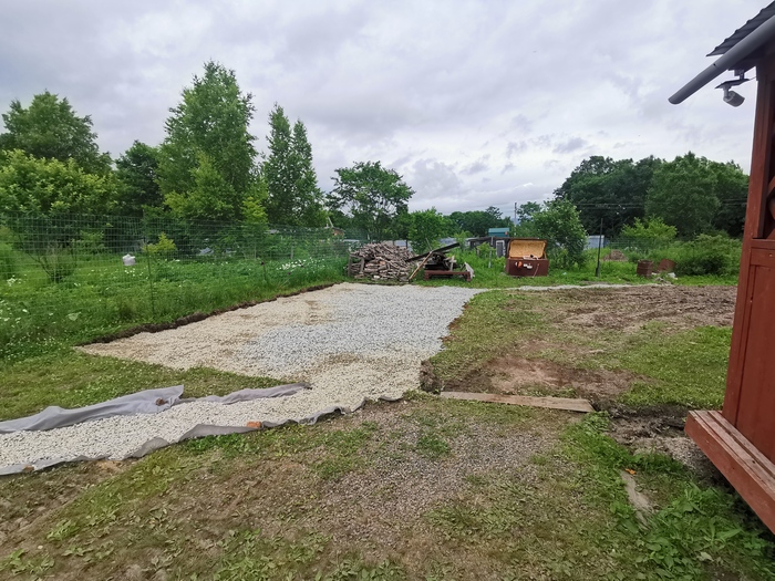 Отсыпали тачанкой, помогали загружать жена и дети =) я возил =) между песком и щебнем ложили геотекстиль 200. Где мангальная зона (которая меньше) положил спандбонд 200 тоже плотный но другой ( в общем не хватило просто рулона гео пришлось сгонять в ближайший магаз и там взять что было, а был такой спандбонд, думаю что народ такое порой без таких базовых закладок делает и все стоит веками). При отсыпке и выравнивании площадки выяснилось что перепад высоты около 40 см =) что приказал везти ещё щебня!