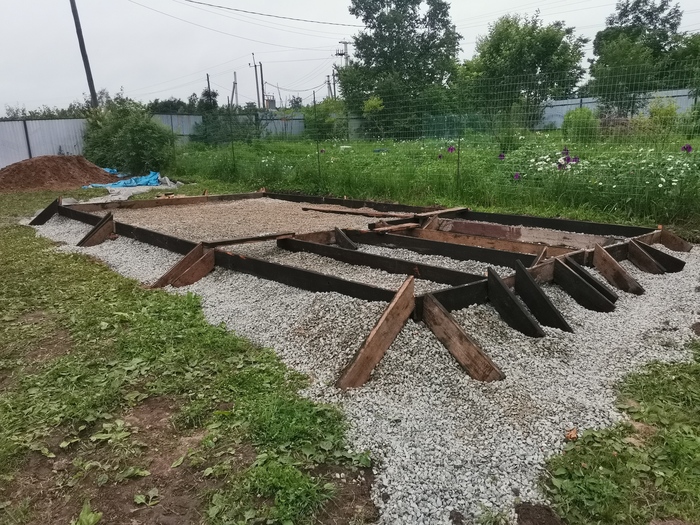 Далее начал выстраивать опалубку. Как оно правильно делается в деталях не знал только то что в голове представлял. Доски были полугнилые с пола в гараже. Из них сделал то что сделал =)