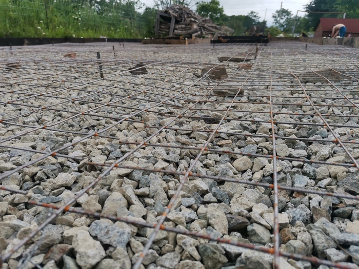 В "общем и целом" 😂 начал ложить сетку. Забивал арму в площадку где по метру длиной и к ней привязывал сетку. Думал сначала приварить. Но меня остановили и сказали что так не делают =)