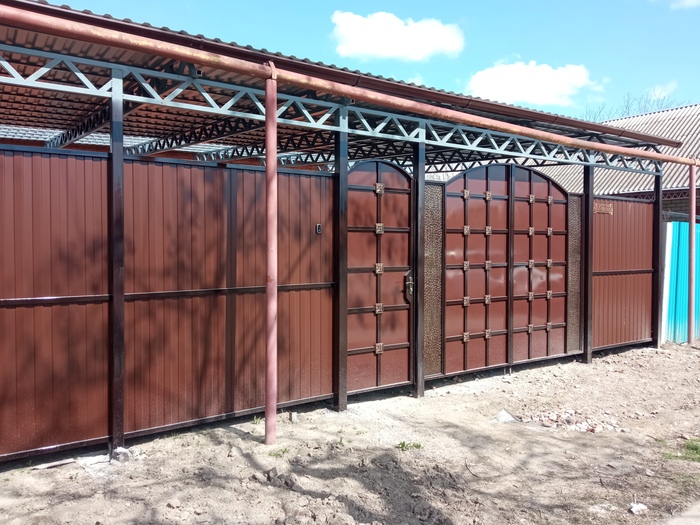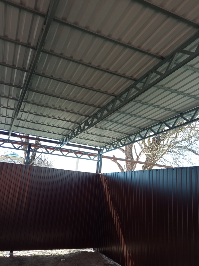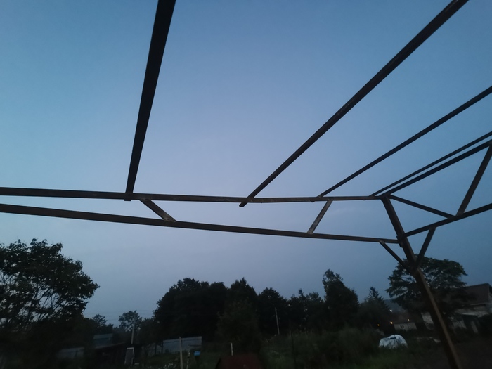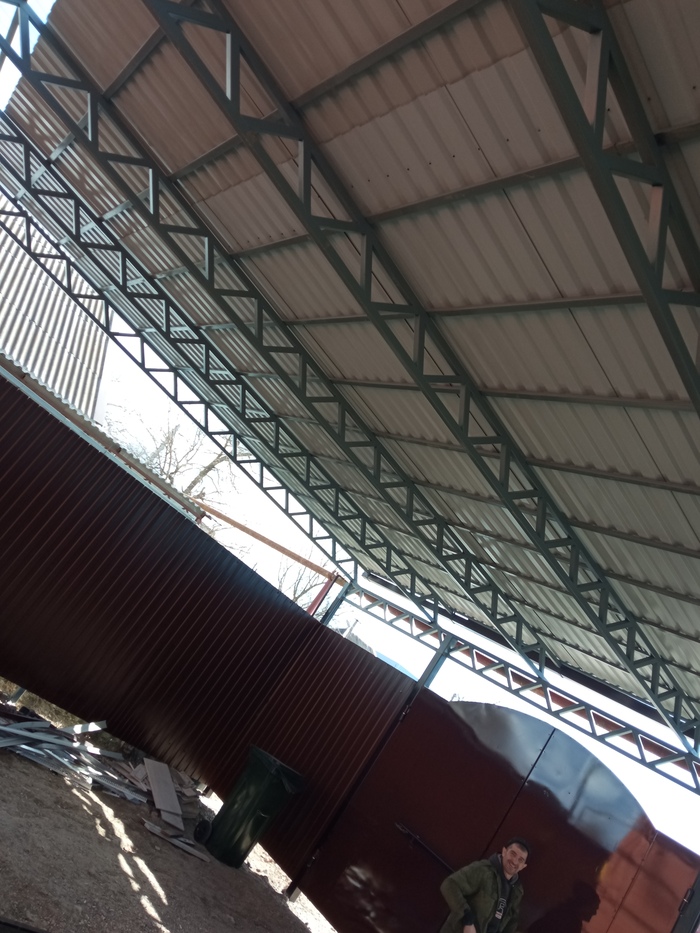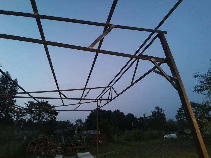 Что получилось в первый день. Понял я в этот момент что основной карка надо было выполнять из профиля 60х60 это дало бы большую жёсткость конструкции. Пришлось варить небольшие фермы. Для увеличения жёсткости. Не без косяков конечно. Конструктивных. Надо было металл примыкать торцами, а не боковыми прилеганиями. Но то что приваренно никуда не денется. Я спокойно висел на нём и лазал по нему.