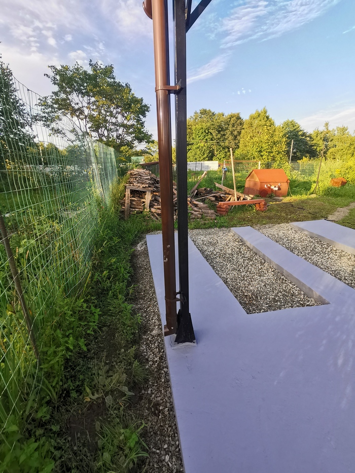 И на ливневке я напорол косых 😔 не посмотрев видосов начал учится на своих личных ошибках. Это свес кровли на середину водостока =) он не доходили. И вода льётся мимо 😂 но здесь я не расстроился. Т. К. Все равно ещё делать мангальную зону и там останется много обрезков по длине которыми я увеличу свес. Эти ошибки даже приятны так как на них ты многое понимаешь что и почему и следующий раз делаешь на опыте. Ещё один трабл это забыли про грунтовку бетона перед окрашиванием. А краску взяли резиновую. Но я не расстроился потому что краска была неудачная. В следующем году положу плитку на поверхность что выровняет мелкие неровности и не будет боятся трения от ножек бассейна и лестницы.