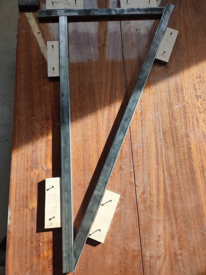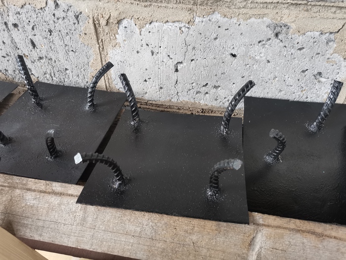 Сварил их из листа железа 2или 3 мм толщиной и арматуры. В этот момент я в первые в руках держал сварочник. Сварочник купил самый дешёвый китайский полуавтомат без газа. Надо было брать метал под площадки мм 10 и монтировать непосредственно на место заливки до неё. Так бы получилось спокойно их выставить по уровню и лучше профиксить. У меня же в голове иллюзии другие были. Что когда зальют бетон я их сверху просто положу. Далее пойму почему это не фонтан идея =)