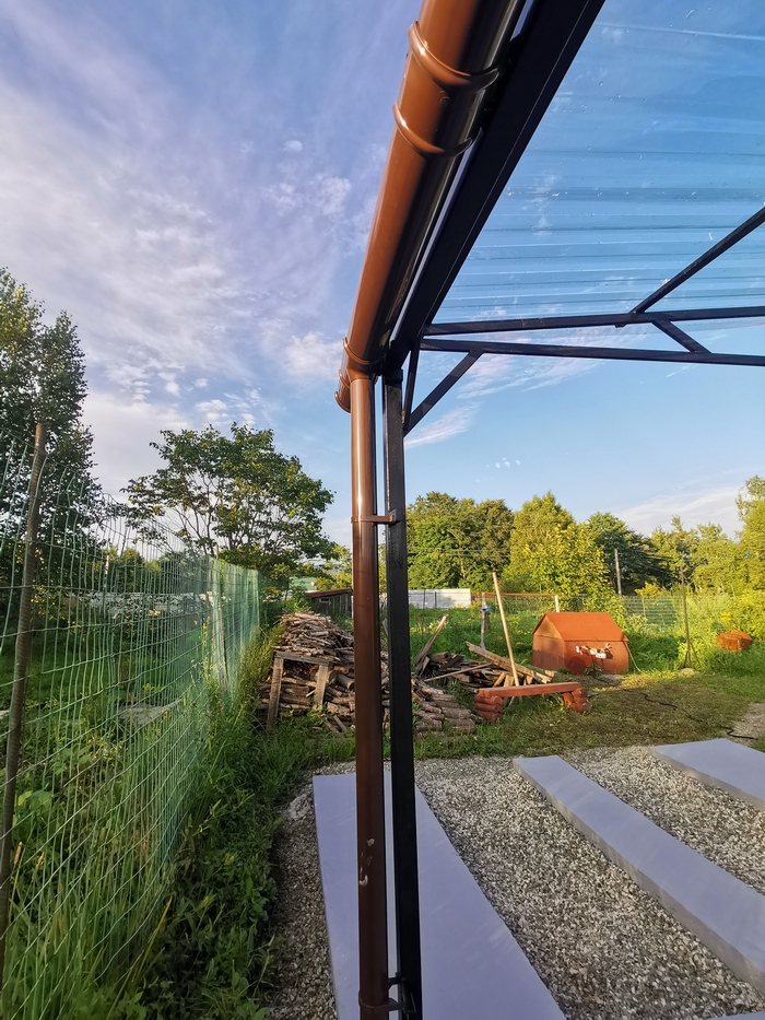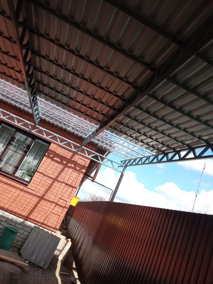 Далее встал выбор кровли. Хотелось не создавать тень. Поэтому выбрал гибкий профилированный поликарбонат с уф защитой прозрачный. У нас он называется гибкий шифер. Многие пишут что он разваливается через год и т. д. Но у тех у кого покупал на улице специально был прикручен образец под открытым небом видно что не первой свежести при этом сохраняющий свои гибкие свойства. Главное это правильный монтаж т. к. Одна сторона имеет уф защиту, а другая нет.